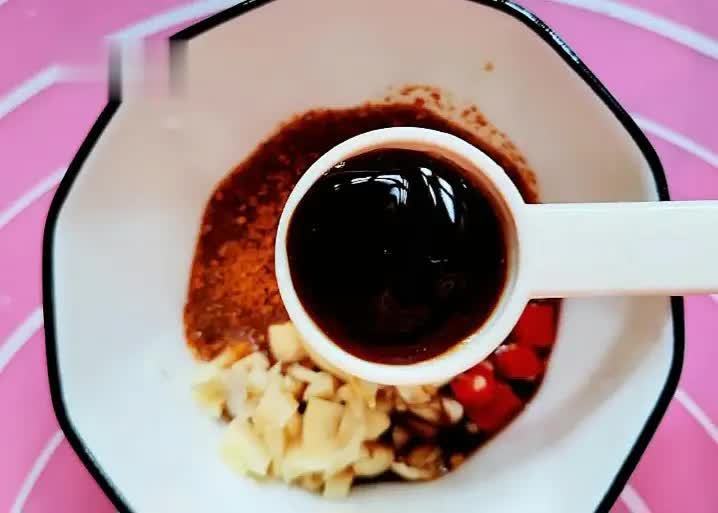 步骤2碗中放入蒜末、辣椒粉、小米椒,倒入2勺酱油、一勺米醋、一勺蚝油。